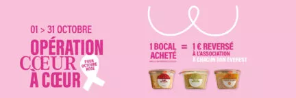 Du 1er au 31 octobre, nous lançons l’opération baptisée « Cœur à cœur », qui s’appuie sur une mécanique commerciale simple. Pour un bocal acheté de notre gamme de plats cuisinés aux clients du réseau traditionnel participant à l’opération à savoir les bouchers charcutiers traiteurs, et les PMS*, 1€ sera reversé à l’Association « A chacun son Everest !». Certaines de nos filiales en région relayent cette initiative au travers d’opérations commerciales locales.